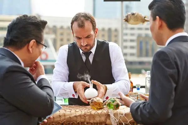 Koktail Charlesa Jolyho je nad kokteilom Cloud, Ron Zacapa Cenenaro, Benedictine, Verjus Rouge, Ginger Dream Tea Jirab a pre exkluzívny konečný dotyk aromatickú paru.